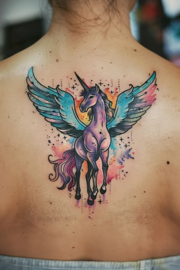 There s something so whimsical and free-spirited about this tattoo. The soft blending of colors, combined with the strong outlines, gives it a balance of bold and delicate. The placement on the upper back makes it feel like Pegasus is lifting right off the skin, adding an element of movement that s just mesmerizing. If you re drawn to tattoos that feel both mythical and artistic, this is a masterpiece that brings pure fantasy to life.