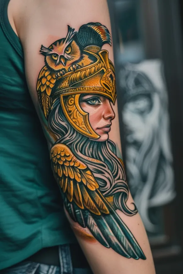 This Athena tattoo is a stunning tribute to the goddess of wisdom and war. The design features a powerful female figure wearing an intricate golden helmet, adorned with classical Greek patterns and subtle engravings. Her piercing blue eyes radiate intelligence and strength, while flowing hair transforms into feathers, seamlessly blending into the majestic owl perched on her head. Rich golds and deep greens create a regal color palette, making every detail pop. The large wings cascading down her arm give the tattoo an elegant, almost divine energy.