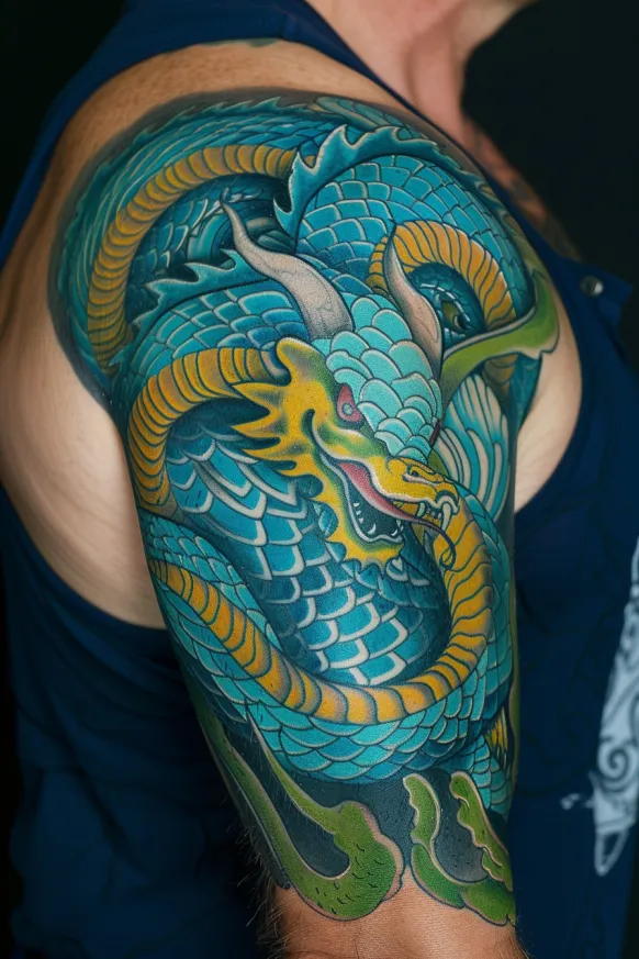 I love how this tattoo feels so alive. The intricate shading and bold color contrast make every detail stand out, from the sharpness of his fangs to the movement in his winding body. There s something so powerful about a design that embodies raw strength and mythology in one. If you want a tattoo that radiates dominance and untamed energy, this is the kind of masterpiece that demands attention.