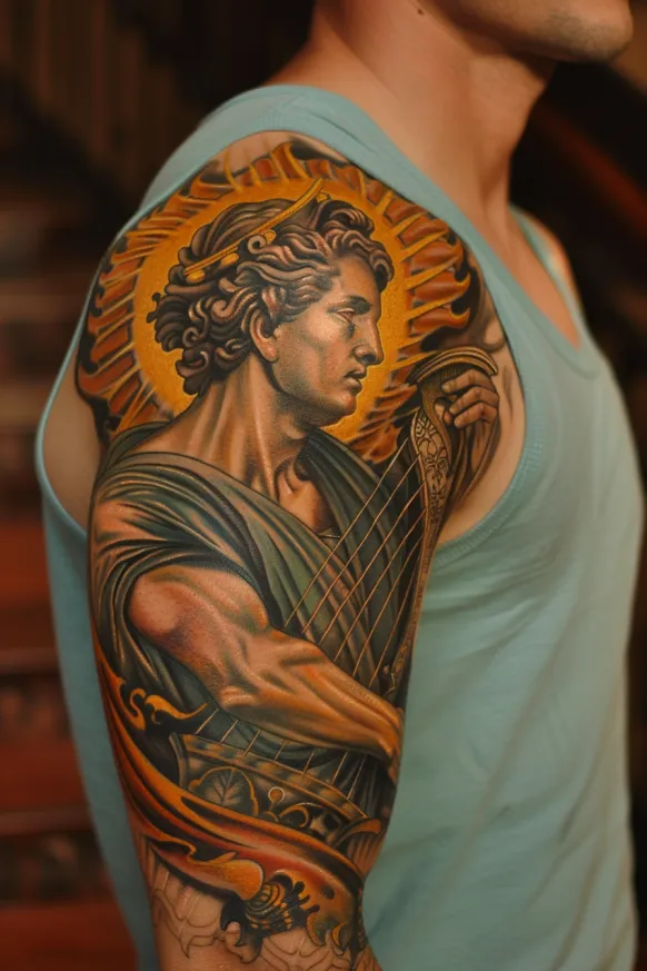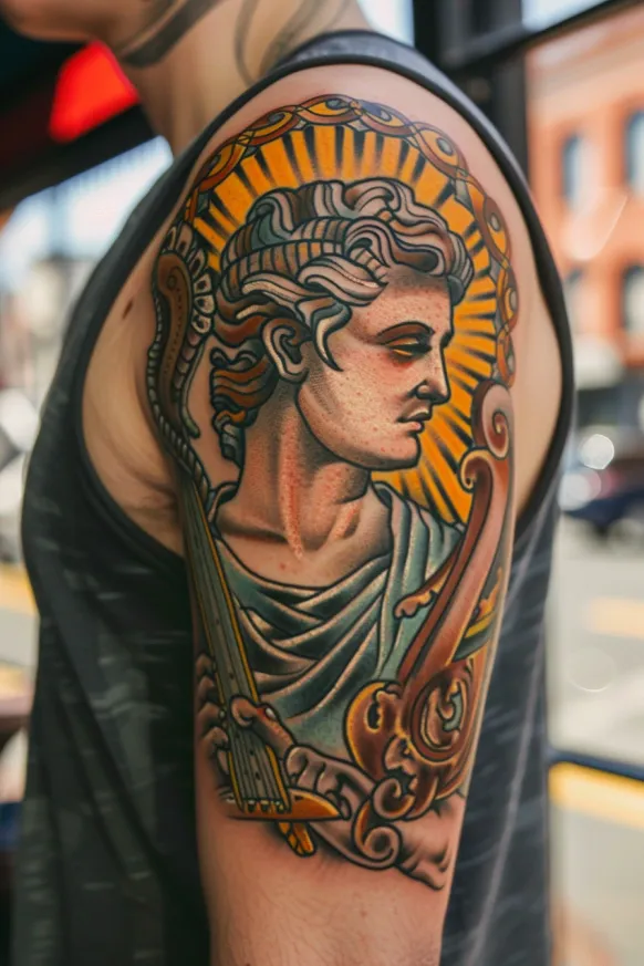 There s something mesmerizing about this tattoo. The way the shading brings depth, combined with the rich gold tones, makes it look like Apollo himself is glowing. The balance between bold black outlines and soft, natural shading gives it that perfect neo-traditional vibe. If you re a fan of mythology and love tattoos that have a regal, timeless feel, this is an absolute dream.