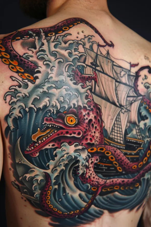 There s something so epic about this tattoo. The sheer scale of it, the movement in the waves, and the fierce expression of the Kraken make it impossible to look away. It s a stunning tribute to Greek mythology s sea monsters, and the way the ship is caught mid-struggle adds a level of storytelling that I just love. This is the kind of design that feels like an adventure on skin.