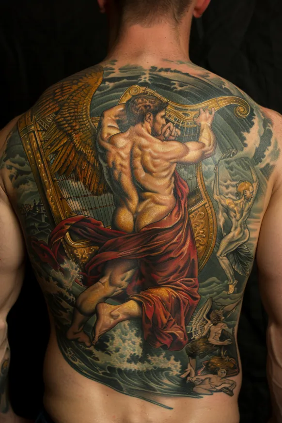 This majestic back piece brings Orpheus, the legendary musician, to life in stunning detail. The tattoo features a powerful, muscular Orpheus draped in flowing red fabric, passionately strumming his golden lyre. Behind him, massive angelic wings blend into the harp, creating a seamless fusion of music and mythology. The background is filled with stormy waves and mythical figures, adding movement and depth to the design. Every stroke of ink captures a sense of divine artistry, making this an unforgettable piece.