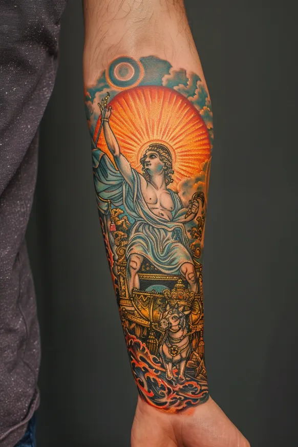 This forearm tattoo captures the fiery power of Helios, the Greek sun god, in stunning detail. Seated on a golden chariot, he commands his divine steeds while reaching for the heavens. His radiant halo glows in brilliant orange and yellow, illuminating the sky behind him. Flowing blue robes contrast against the warm tones, making every detail pop. Below, the flames of dawn curl around the bottom of the design, symbolizing the power of the sun rising each day.