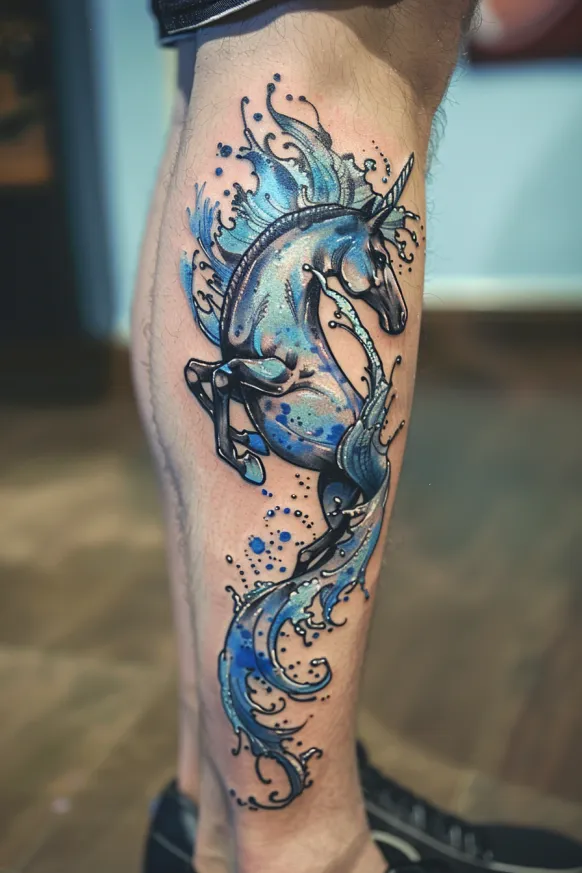 This Hippocampus tattoo is pure ocean magic. The legendary water horse of Greek mythology is captured mid-motion, its powerful body twisting with waves that swirl around it. Deep metallic blues and shimmering silvers bring this sea creature to life, making it feel like it was sculpted straight from the depths of Poseidon s realm. Flowing fins replace its hind legs, curling like crashing waves, while delicate water droplets splash outward, adding a touch of movement. Every detail, from the intricate scales to the sharp, mystical horn, makes this design feel ethereal.