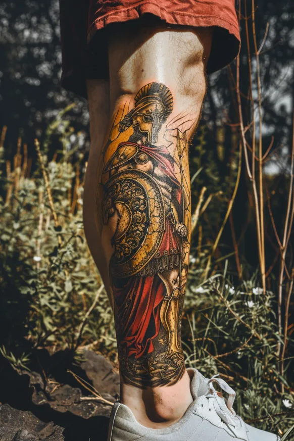 Everything about this design exudes strength, resilience, and honor. The rich gold tones and bold red cape create an eye-catching contrast that makes the warrior stand out even more. It s the kind of tattoo that tells a story, symbolizing bravery, determination, and an unbreakable spirit. If you re drawn to warrior energy and legendary Greek history, this one is a showstopper.