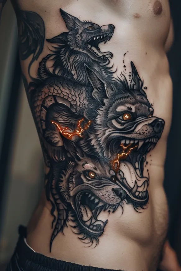 This Cerberus tattoo is pure power. The three-headed guardian of the underworld comes to life in an intricate black and grey design that stretches across the ribs, making it as fierce as the beast itself. Each snarling head has razor-sharp teeth, wild fur, and piercing glowing eyes that seem almost alive. Crackling lava-like energy runs through the design, adding a supernatural effect that makes the whole piece feel electric. The flowing serpent-like body wraps around, giving it a sense of movement and chaos that fits this legendary beast.
