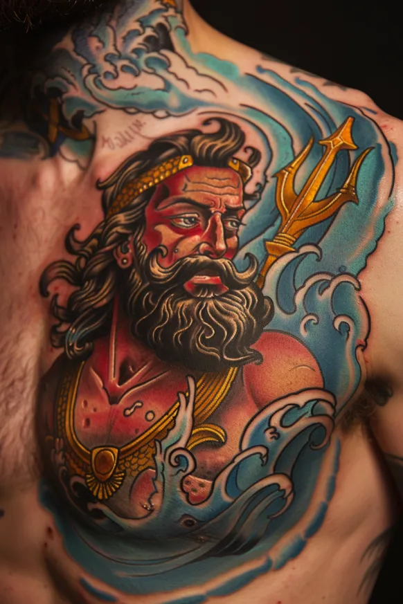 This Poseidon tattoo is nothing short of legendary. The god of the sea is captured in a powerful, dynamic pose, his piercing gaze set against the backdrop of raging waves. His flowing beard and windswept hair add movement, while the bold blue tones of the swirling ocean contrast beautifully with the golden trident and royal adornments. The intricate detailing on his crown and jewelry gives him a regal presence, making it clear that he commands the seas. The tattoo stretches across the chest, giving it a commanding presence that suits the grandeur of the design.