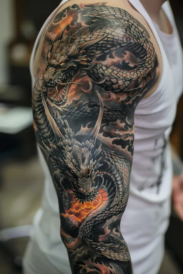 This Typhon tattoo is pure chaos in the best way. The father of all monsters from Greek mythology is brought to life with a massive black and grey sleeve, filled with intricate serpent-like scales and razor-sharp fangs. His menacing eyes glow, piercing through the stormy smoke that swirls around his body. Fiery bursts of molten orange and red crackle within the darkness, adding an intense contrast that makes the design feel almost alive. The writhing dragon-like body twists around the arm, creating a sense of movement that adds to the raw power of this design.