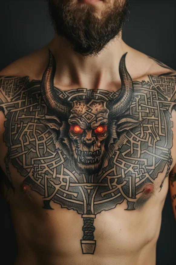 This Minotaur tattoo is the definition of fierce. The legendary beast of the Labyrinth takes center stage in this bold chest piece, with an intense snarl and glowing red eyes that seem to burn straight through the skin. His massive, curved horns extend outward, blending into an intricate knotwork pattern that adds a mythical, almost enchanted feel to the design. The deep black shading and heavy linework give the entire tattoo a powerful presence, making it impossible to ignore. The way the geometric patterns wrap around the chest adds symmetry, making the design feel structured yet wild at the same time.