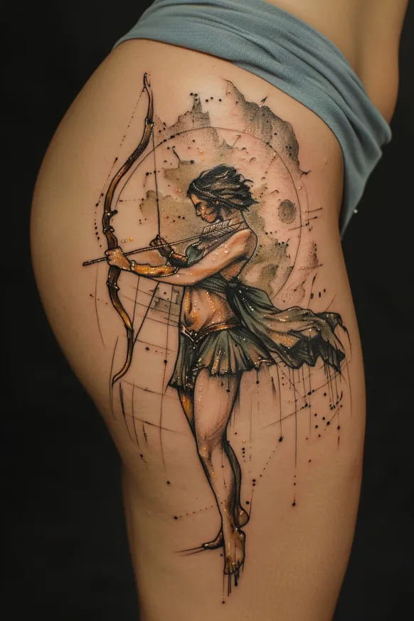 This Artemis tattoo is pure divine energy, capturing the goddess of the hunt in all her fierce and graceful glory. She is mid-draw with her bow, her figure framed by a celestial backdrop that gives the piece a dreamlike quality. The delicate linework and watercolor-style shading make the design feel almost weightless, as if she is floating. The flowing fabric and soft gold accents add a touch of femininity, perfectly balancing her warrior spirit with elegance.