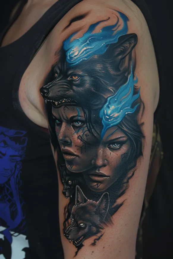 This Hecate tattoo brings an intense, mystical energy to the shoulder. The triple-faced goddess stares forward with piercing eyes, surrounded by dark runes and ethereal blue flames that give the piece a supernatural glow. Her black wolves, symbols of guidance through the unknown, add an untamed, almost eerie presence. The deep shadow work and hyper-realistic shading make the faces feel alive, while the vivid blue flames add an unexpected contrast that makes the whole design pop.