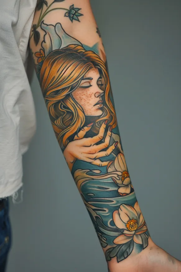This breathtaking forearm piece captures the ethereal beauty of a water nymph, her serene face framed by flowing golden hair. Her eyes remain closed as if lost in a dream, while delicate freckles dot her cheeks, adding a natural charm. Surrounding her, soft blue waters swirl, with gentle ripples extending into blooming white magnolia flowers. The tattoo seamlessly blends neo-traditional and illustrative styles, using rich shading and smooth gradients to create depth and movement.