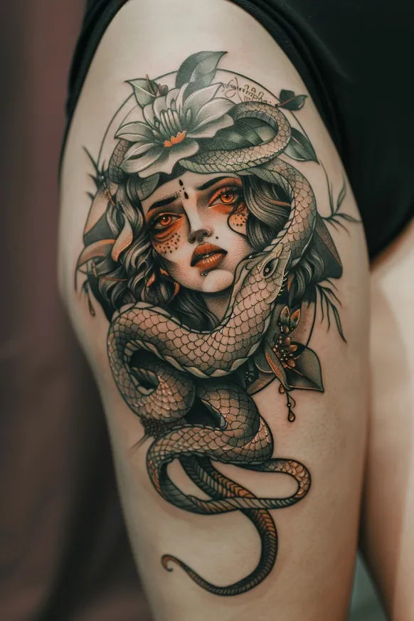 There s something so mesmerizing about this tattoo. The blend of soft and bold elements makes Medusa feel both powerful and tragic, capturing the duality of her myth. The snake s sinuous form adds movement, while the deeply expressive gaze gives the whole piece a sense of mystery. If you love mythology-inspired tattoos that mix elegance with edge, this is a breathtaking choice.