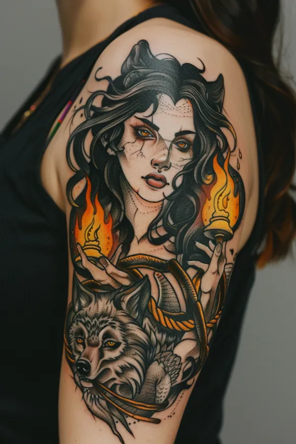 This Hecate tattoo radiates pure mystery and power. The Greek goddess of magic, the night, and crossroads is depicted with her signature torches burning bright, illuminating her intense, otherworldly gaze. Flowing dark hair frames her face, with cracks in her skin giving her an ethereal, almost supernatural look. Below, a wolf companion stares ahead, symbolizing protection and loyalty, while a coiled rope winds through the design, adding an element of fate and mysticism. The shading is rich and bold, with deep blacks and fiery oranges bringing incredible contrast.