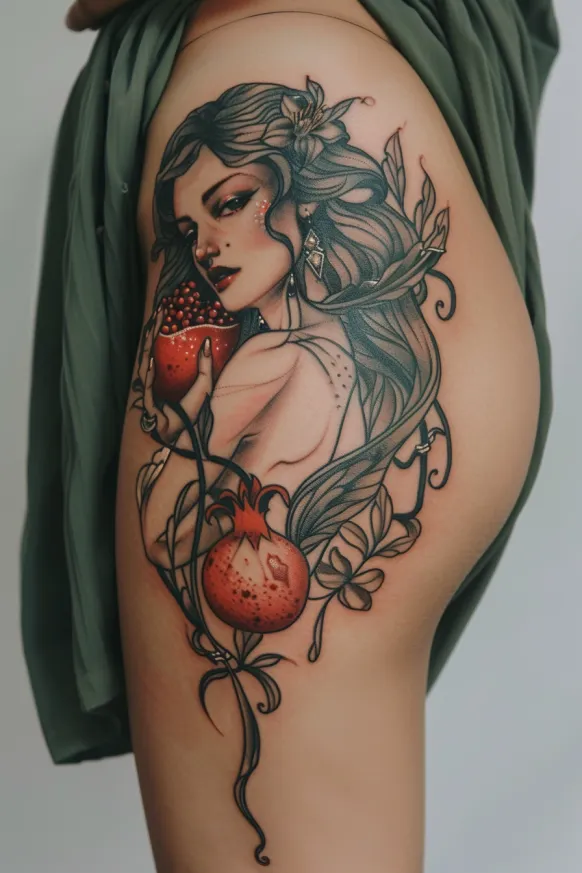 There s something so enchanting about this tattoo. The balance between femininity and power makes it feel like a true tribute to Persephone s story. The rich ruby-red tones of the pomegranates add just the right touch of drama, and the flowing lines make it look effortlessly graceful. If you love mythology and want a tattoo that exudes both mystery and elegance, this is a stunning choice.
