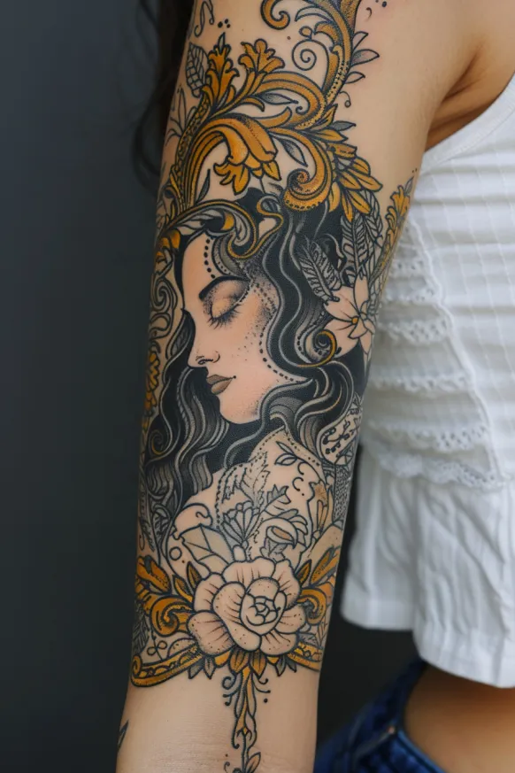 This Persephone-inspired sleeve is pure elegance, combining Greek mythology with soft botanical elements. The delicate profile of the goddess is framed by ornate golden flourishes and intricately detailed flowers, creating a dreamlike effect. The fine linework and subtle shading give it a timeless, almost storybook feel, while the soft earthy tones blend beautifully with the skin. Every curve and detail feels intentional and graceful, making this piece a stunning example of mythology meeting feminine beauty.