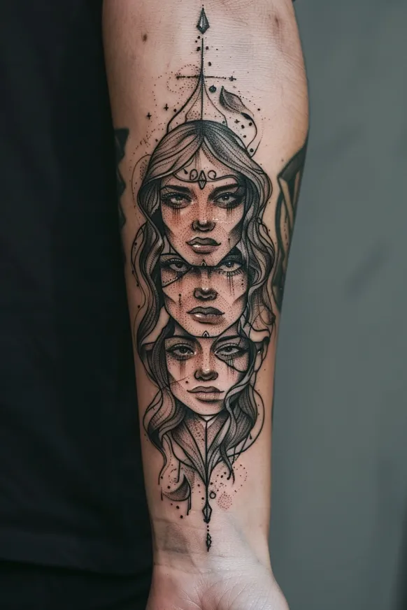 There s something so hypnotic about this tattoo. The soft, ethereal quality of the faces combined with the bold geometric elements creates a perfect balance of strength and grace. The placement on the forearm makes it feel like a personal reminder of life s journey, adding a deeply symbolic touch. If you love mythology and appreciate tattoos with meaning, this is an absolutely stunning way to wear a piece of ancient wisdom.