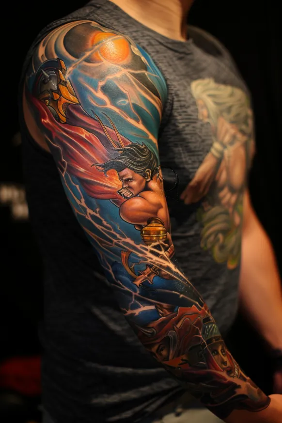 This tattoo is beyond impressive. The rich, vibrant colors, from deep blues to fiery oranges, create an eye-catching contrast that makes every detail stand out. The lightning bolts streaking through the sky give it an electrifying energy, making Zeus look truly unstoppable. If you love bold, high-energy designs that scream power and mythology, this is a legendary choice.
