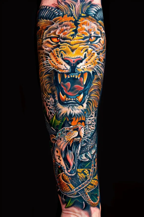 This is the kind of tattoo that refuses to go unnoticed. The hyper-detailed fur, scales, and fangs create an electrifying look that feels almost alive. The way the colors blend and contrast makes every part of the Chimera stand out in a way that feels both mythical and modern. If you re all about tattoos that symbolize power, chaos, and untamed energy, this sleeve is a breathtaking choice.