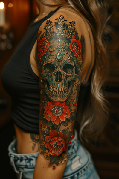 Skull and Roses Sleeve Tattoo with Crowned Jewels