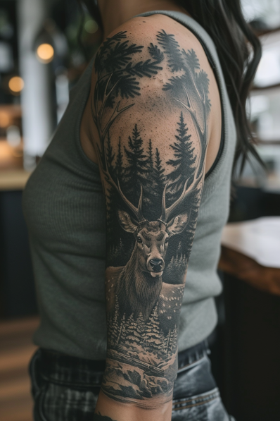 This beautifully crafted tattoo sleeve features a serene deer standing amidst a dense, shadowy forest. The deer, with its elegant antlers and calm demeanor, serves as the centerpiece of the design, embodying grace and a deep connection to nature. Surrounding the deer, towering pine trees create a rich, textured background, their branches stretching upwards as if reaching for the sky. The subtle shading and detailed linework give the forest scene a sense of depth and mystery, making the entire sleeve feel like a window into a peaceful, woodland world.