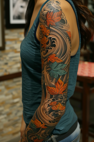 I m absolutely loving the autumn vibes of this leaves and wind sleeve! It s like you can almost feel the cool breeze and hear the rustling of the leaves. The way the leaves are so carefully detailed really brings out the beauty of the season, while the swirling wind adds a dynamic, almost hypnotic movement to the design. It s a perfect blend of nature s beauty and the changing of seasons, making it an ideal choice for anyone who loves fall or just appreciates the ever-changing cycle of life. If you re into tattoos that are as full of life as they are artful, this sleeve is a true masterpiece.