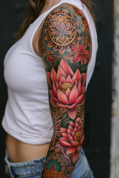 Lotus Flower Sleeve Tattoo with Mandala Accents