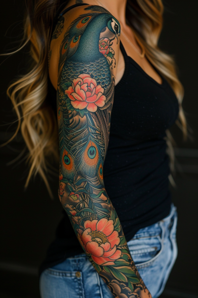 This exquisite tattoo sleeve showcases the majestic beauty of a peacock, with its vibrant feathers cascading down the arm, paired with the delicate elegance of blooming peonies. The peacock is rendered in rich shades of blue and green, its intricate feathers detailed with eye-catching patterns in orange and teal. The peonies, in soft pinks and corals, add a floral contrast that enhances the overall design, creating a harmonious balance between the bold and the delicate. The flowing nature of the feathers combined with the soft curves of the peonies gives this sleeve a graceful yet striking appearance.