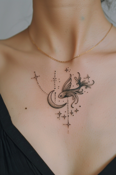 This delicate tattoo showcases a graceful fish swimming around a crescent moon, surrounded by sparkling stars and dotted celestial details. The fine lines and minimalist design give it an elegant and lightweight feel, while the crescent moon adds a mystical touch that ties in beautifully with Pisces intuitive and dreamy nature. The overall composition is simple yet deeply symbolic, making it perfect for subtle placement.