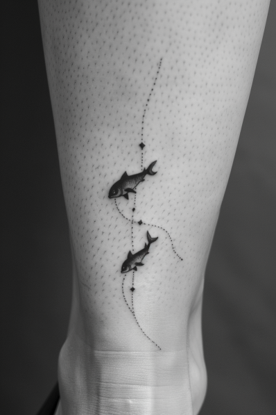 This tattoo takes a minimalist approach to Pisces symbolism, featuring two small, sleek fish connected by a delicate dotted line. The fish are subtly shaded, giving them a clean, modern look, while the dotted details add a touch of elegance and flow to the design. It s understated yet meaningful, perfect for someone who prefers a minimalist aesthetic with a personal connection to their zodiac.