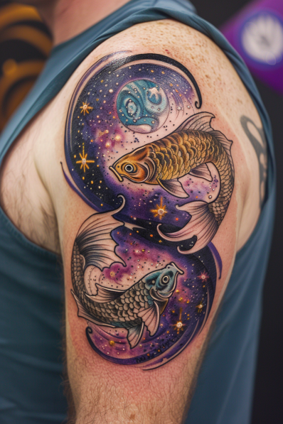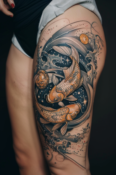 This is the kind of tattoo that leaves you speechless it s a whole story on your skin. The blend of water and space perfectly captures the Pisces connection to the unknown and their fluid, intuitive nature. The golden fish add a regal touch, making the design feel bold yet elegant. If you re a Pisces who loves to make a splash, this tattoo is an epic choice that s hard to beat!