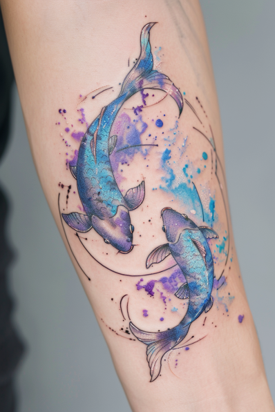 This tattoo is a vibrant, artistic take on the Pisces zodiac, featuring two koi fish swimming in a yin-yang motion surrounded by watercolor splashes in stunning shades of blue and purple. The painterly effect gives the tattoo a dreamy, fluid feel, while the delicate line work subtly keeps the design structured. The mix of abstract splashes and realistic fish detailing creates a beautiful balance between chaos and calm, mirroring the Pisces emotional depth and creativity.
