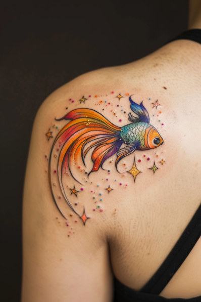 This tattoo features a single, vividly colored fish with flowing fins that seem to shimmer in shades of orange, yellow, blue, and pink. The dynamic design is accentuated by sparkling stars and playful dots scattered around, creating a cosmic yet whimsical vibe. The fine details in the fish s scales and the soft, radiant gradient of colors make it look alive and bursting with energy.