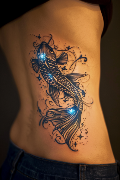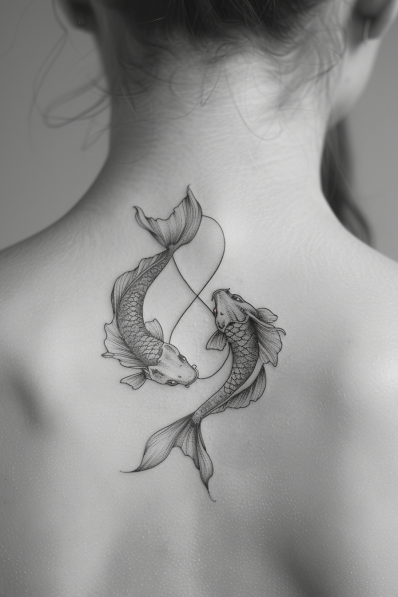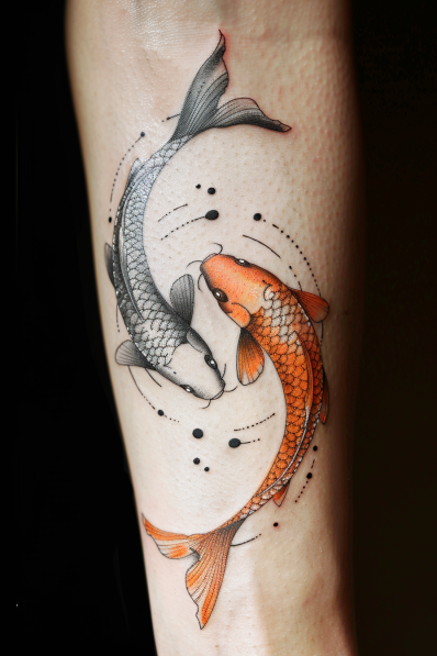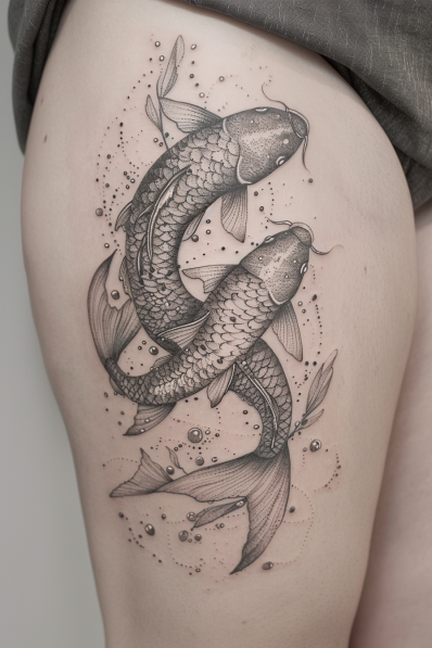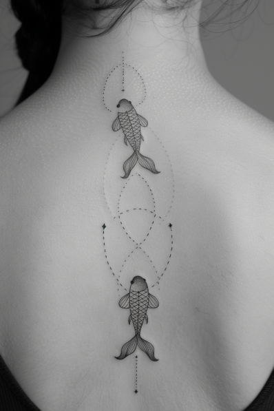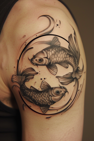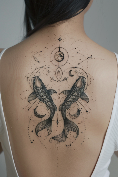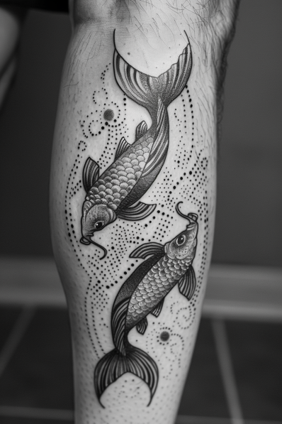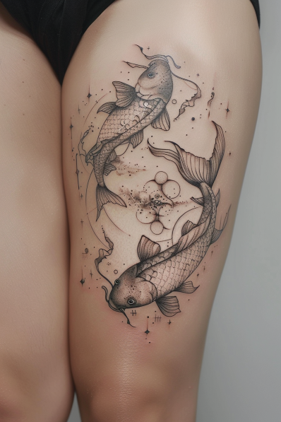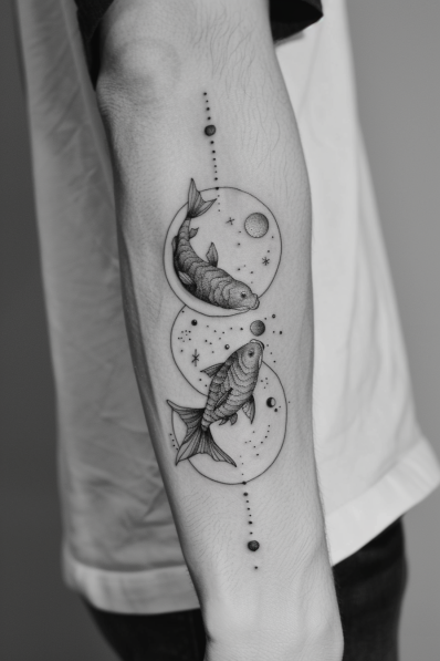 Honestly, I m in love with this one. It s not just a tattoo it s a full-blown artistic statement. The way it captures the Pisces natural balance and adaptability through the koi s elegant movement is genius. Plus, those tiny dots and swirls? They add just the right amount of flair without going overboard. If I were a Pisces, I d be booking my appointment right now.