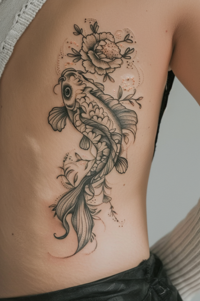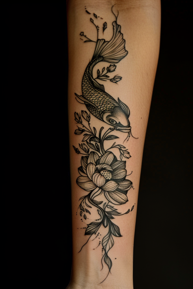 This tattoo merges the elegance of a flowing fish with the beauty of blooming flowers, creating a harmonious design that feels both natural and artistic. The fish is intricately detailed with fine linework and textured scales, gracefully swimming around a large, blooming flower. Delicate leaves and small buds add an organic touch, while the balance between the fish and floral elements creates a stunning composition that exudes grace and femininity.