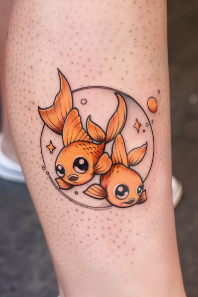 This tattoo takes a playful approach to the Pisces symbol with two adorable orange fish drawn in a cartoon style. Their wide, sparkling eyes and exaggerated fins give them a fun, whimsical vibe, while the soft shading adds dimension. Encased in a circular background with tiny stars and bubbles, the design feels lighthearted and cheerful, perfect for someone who loves a touch of humor and cuteness in their ink.