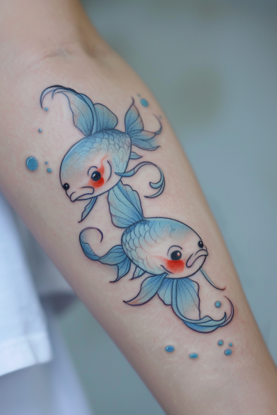 This tattoo features two adorable, cartoon-like fish with soft blue and white tones. Their round shapes and expressive faces add a whimsical touch that makes the design feel fun and lighthearted. Tiny water bubbles scattered around the fish enhance the underwater vibe, while the subtle blush tones on their cheeks bring a playful and charming personality to the piece.