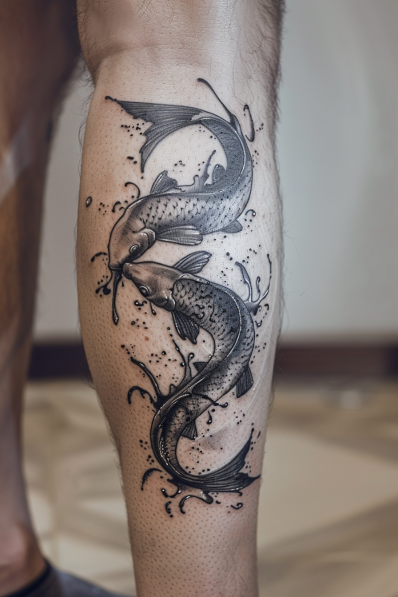 This striking tattoo embodies the Pisces spirit with two monochrome koi fish swimming in perfect harmony. The shading work brings out incredible depth, giving the fish a lifelike and dynamic appearance. Each koi features detailed scales and flowing fins, while the surrounding splash effects create a sense of movement that ties the design together beautifully. The balance between the light and dark tones reflects the duality of the Pisces sign in a bold and artistic way.