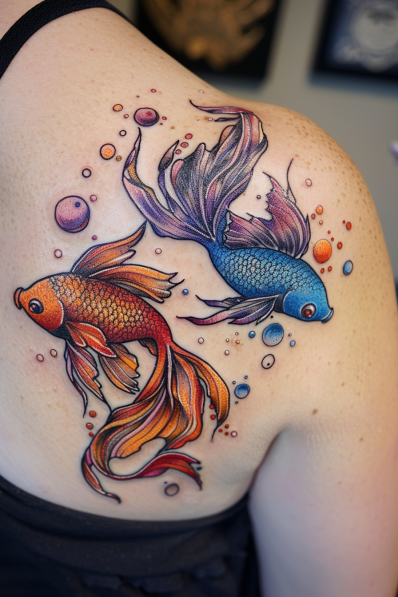 This tattoo explodes with color, featuring two vividly detailed fish swimming amidst a flurry of bubbles. One fish shines with fiery orange and red hues, while its counterpart glows in deep blues and purples, creating a striking contrast. The flowing fins and intricate scales give the design a dynamic, almost fluid motion that perfectly represents the Pisces connection to water. The playful placement of the bubbles adds a whimsical, underwater feel to the piece.