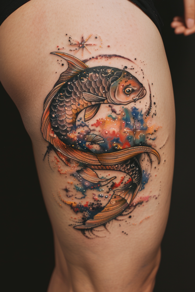 I m in awe of how much life this tattoo packs into its design. The balance of the yin-yang layout with the cosmic colors makes it a showstopper. It s perfect for someone who wants their Pisces tattoo to stand out while staying deeply symbolic. The mix of celestial elements and vibrant tones creates a look that s both bold and meaningful a true Pisces masterpiece!