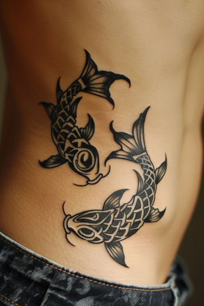 This bold tattoo reimagines the Pisces symbol with two koi fish in a tribal design. The intricate black ink patterns on the fish create a striking look, blending traditional tribal art with the flow and movement of Pisces energy. The symmetry of the fish adds balance, while the sharp lines and bold curves give it a dynamic and powerful vibe. This design is all about making a statement while staying connected to the Pisces duality and water element.