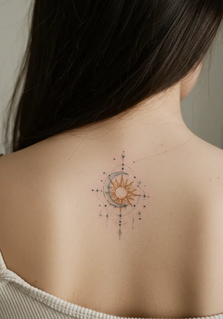 This celestial tattoo is a dreamy mix of sun and moon magic, centered delicately between the shoulder blades. The golden sun radiates warm, fine-lined energy, while a soft silver-blue crescent moon wraps around it like a cosmic embrace. Tiny stars, dots, and constellation-style accents surround the central design, giving it a beautiful sense of symmetry and flow. The lines are whisper-thin and precise, making the whole piece feel light as stardust.