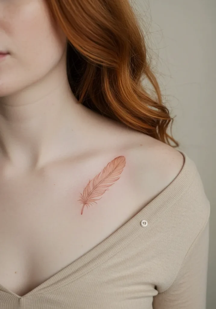 This dainty fine line tattoo features a single feather inked just above the collarbone in a soft reddish-brown hue. The detail is incredibly subtle, with thin, wispy lines that give it a weightless, airy vibe. The placement makes it feel elegant and intimate, sitting right where a delicate chain necklace might rest. It s minimal, feminine, and so beautifully balanced with the natural curves of the body.