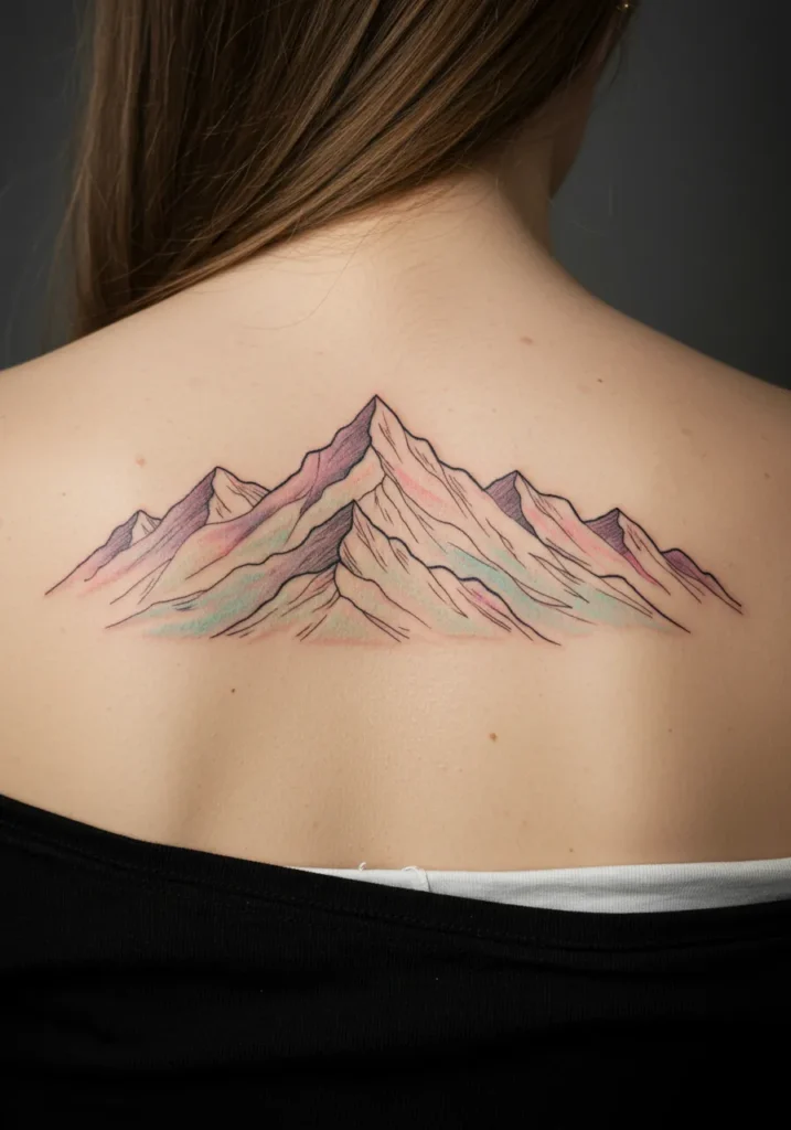 This gorgeous back tattoo features a sprawling mountain range drawn in soft, dainty lines and shaded with delicate pastel tones. Each peak is outlined with precision, creating a crisp silhouette that contrasts beautifully with the watercolor blush of pinks, purples, and minty greens. The placement across the upper back lets the design stretch naturally, like a horizon hugging the shoulder blades.