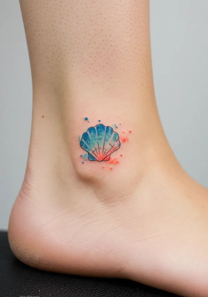 This adorable seashell tattoo sits just above the ankle like a tiny ocean treasure. The shell is outlined in delicate fine lines and filled with a dreamy watercolor blend of ocean blue and coral pink, giving it that just-washed-up-on-the-shore feel. Soft splashes of color radiate around the edges, like little bursts of salty sea spray. The size makes it sweet and subtle, perfect for bare ankles and beachy vibes.