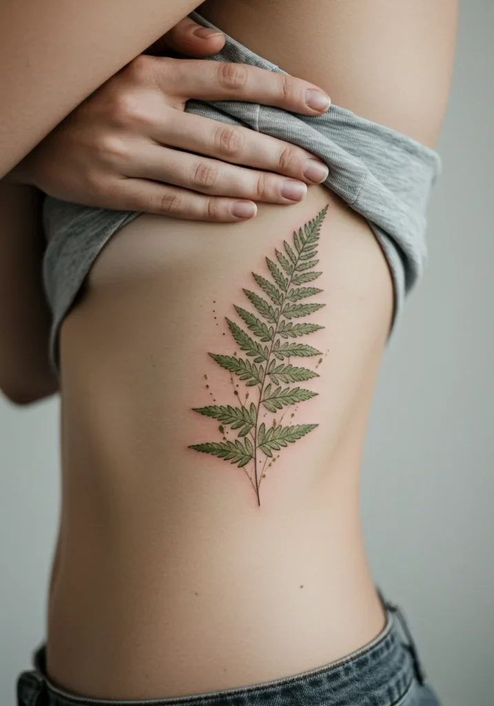 This elegant fern tattoo flows naturally along the ribcage, following the body s curve like it was always meant to be there. The fine line detailing captures each tiny leaflet with botanical precision, while the soft green shading gives it an earthy, calming vibe. Dotted accents add just a touch of whimsy without distracting from the clean structure of the design. It s delicate but definitely not plain.