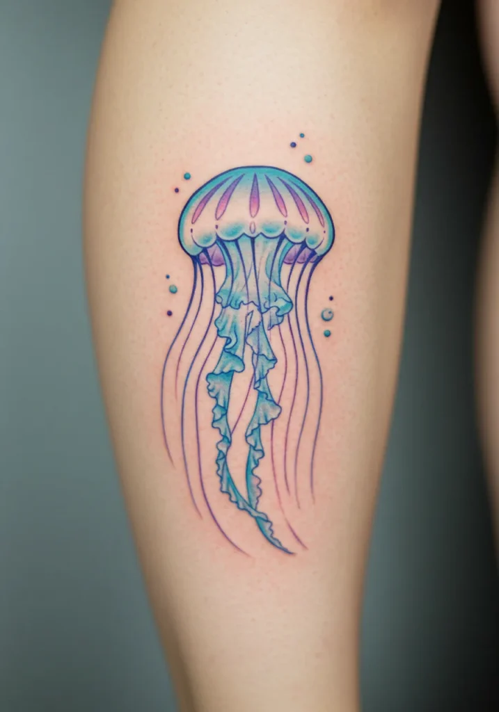 This dainty jellyfish tattoo is a colorful underwater dream. It s placed neatly on the calf, with soft fine lines that create a floating, fluid motion. The body of the jellyfish glows in a gradient of purples and teals, while the tentacles trail down like delicate ribbons. Tiny bubbles dot around the design, adding a sweet little touch of ocean magic. It s crisp, it s vibrant, and it still keeps that light, airy vibe that makes fine line work feel so special.