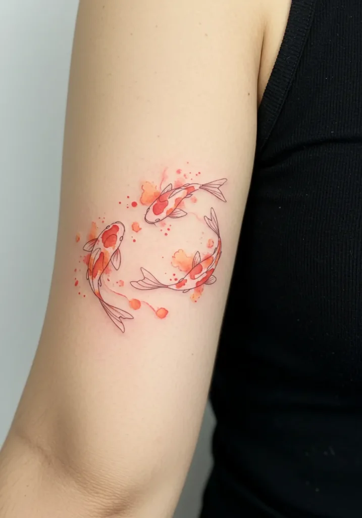 This dainty koi fish tattoo features three graceful fish circling in a fluid spiral, placed delicately on the upper arm. The design uses soft fine lines to outline the koi, while splashes of watercolor in orange and coral give them a dreamy, almost floating effect. Each fish has a unique little shape and direction, which brings the whole piece to life like a slow, gentle swim. The negative space between them adds to the light and airy feeling, making it feel both peaceful and free.