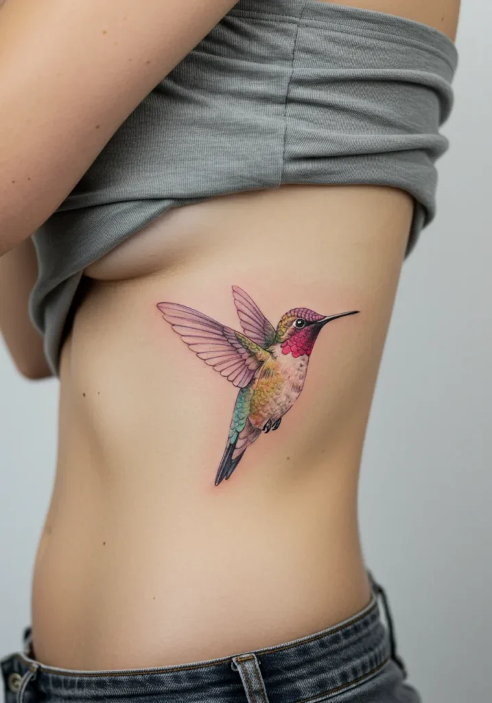 This stunning rib tattoo captures a vibrant hummingbird mid-flight, crafted with incredibly fine lines and soft gradients of color. The wings shimmer in light pinks and purples while the feathers on the body flow from a golden yellow into touches of teal and green. Its beak is long and graceful, pointing forward like it s just about to zip off again. The placement hugs the natural curve of the ribcage, making it both delicate and dynamic.