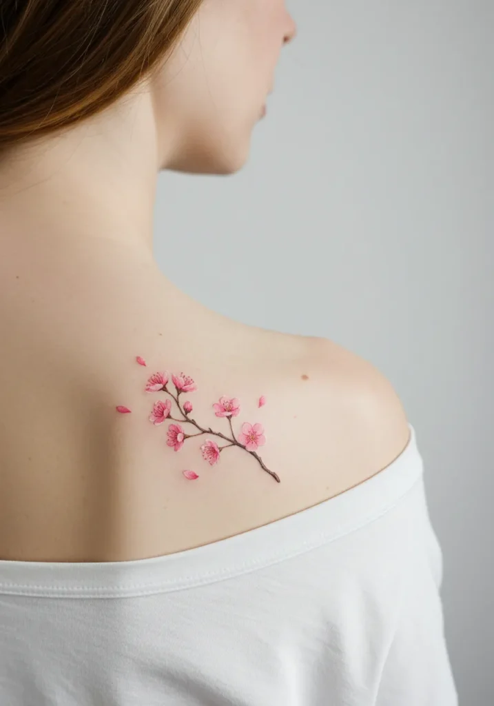 This lovely cherry blossom tattoo sits gracefully on the upper shoulder, just where the curve meets the collarbone. It features a slender branch dotted with delicate pink blooms and soft petals floating away as if caught in a spring breeze. The fine linework gives it that featherlight feeling, and the subtle shading on each petal adds a soft sense of depth without ever feeling heavy. It s the perfect blend of minimal and romantic.